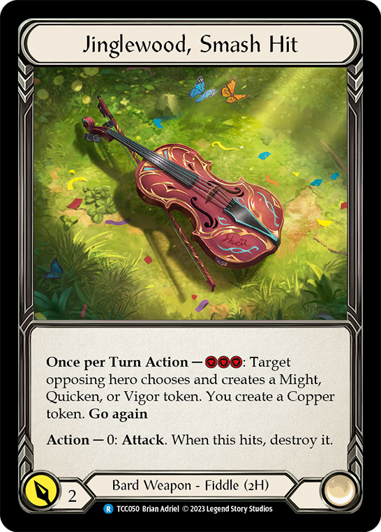 Once per Turn Action -- {r}{r}{r}: Target opposing hero chooses and creates a Might, Quicken, or Vigor token. You create a Copper token. Go again