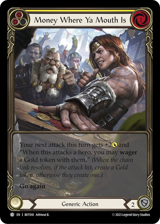Your next attack this turn gets +2POWER and "When this Attacks a hero, you may wager a Gold token with them." (When the chain link resolves, if the attack hit, you create a Gold token, otherwise they create one.)