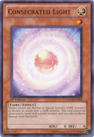 Neither player can Normal or Special Summon DARK monsters or declare an attack with a DARK monster. This card cannot be destroyed by battle with a DARK monster, and you take no Battle Damage from that battle.
