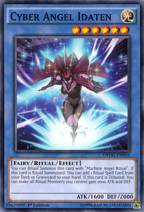 You can Ritual Summon this card with "Machine Angel Ritual". If this card is Ritual Summoned: You can add 1 Ritual Spell Card from your Deck or Graveyard to your hand. If this card is Tributed: You can make all Ritual Monsters you control gain 1000 ATK and DEF.