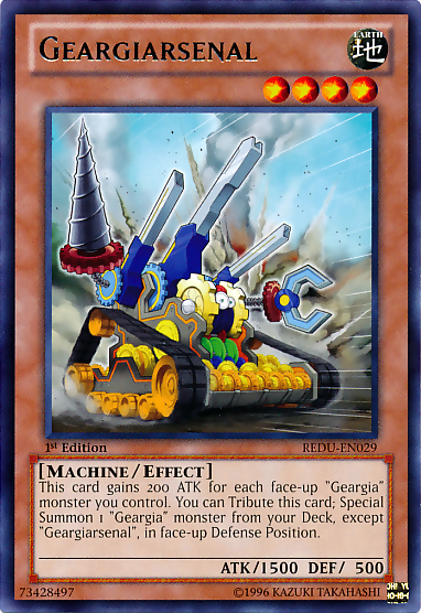 This card gains 200 ATK for each face-up "Geargia" monster you control. You can Tribute this card; Special Summon 1 "Geargia" monster from your Deck, except "Geargiarsenal", in face-up Defense Position.