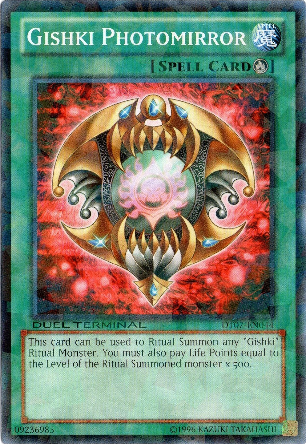 This card can be used to Ritual Summon any "Gishki" Ritual Monster. You must also pay Life Points equal to the Level of the Ritual Summoned monster x 500.