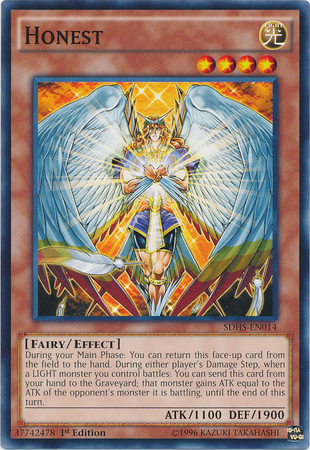 During your Main Phase: You can return this face-up card from the field to the hand. During either player's Damage Step, when a LIGHT monster you control battles: You can send this card from your hand to the Graveyard; that monster gains ATK equal to the ATK of the opponent's monster it is battling, until the end of this turn.