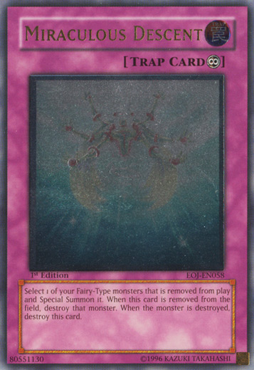 Select 1 of your Fairy-Type monsters that is removed from play and Special Summon it. When this card is removed from the field, destroy that monster. When the mosnter is destroyed, destroy this card.
