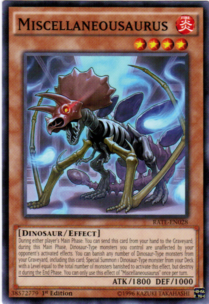 During either player's Main Phase: You can send this card from your hand to the Graveyard; during this Main Phase, Dinosaur-Type monsters you control are unaffected by your opponent's activated effects. You can banish any number of Dinosaur-Type monsters from your Graveyard, including this card; Special Summon 1 Dinosaur-Type monster from your Deck with a Level equal to the total number of monsters banished to activate this effect, but destroy it during the End Phase. You can only use this effect of "Miscellaneousaurus" once per turn.