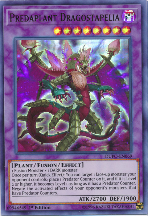 Once per turn (Quick Effect): You can target 1 face-up monster your opponent controls; place 1 Predator Counter on it, and if it is Level 2 or higher, it becomes Level 1 as long as it has a Predator Counter. Negate the activated effects of your opponent's monsters that have Predator Counters.