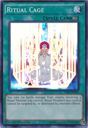 You take no Battle Damage from attacks involving a Ritual Monster you control. Ritual Monsters you control cannot be targeted by, or destroyed by, monster effects.