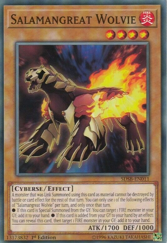 A monster that was Link Summoned using this card as material cannot be destroyed by battle or card effect for the rest of that turn. You can only use 1 of the following effects of "Salamangreat Wolvie" per turn, and only once that turn.