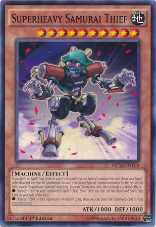 If you have no Spell/Trap Cards in your Graveyard, you can Special Summon this card (from your hand). After this card was Special Summoned this way, you cannot Special Summon monsters for the rest of this turn, except "Superheavy Samurai" monsters. You can Tribute this card, then activate 1 of these effects;