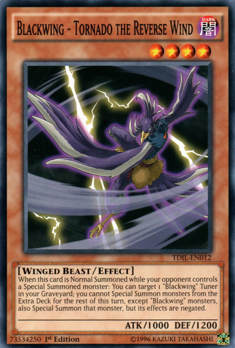 When this card is Normal Summoned while your opponent controls a Special Summoned monster: You can target 1 "Blackwing" Tuner in your Graveyard; you cannot Special Summon monsters from the Extra Deck for the rest of this turn, except "Blackwing" monsters, also Special Summon that monster, but its effects are negated.