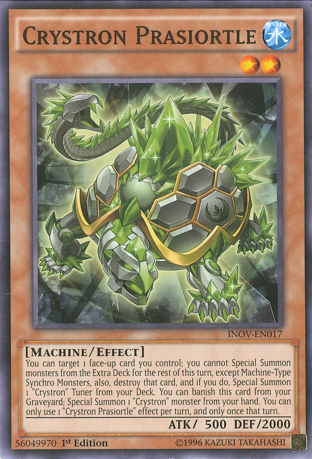 You can target 1 face-up card you control; you cannot Special Summon monsters from the Extra Deck for the rest of this turn, except Machine-Type Synchro Monsters, also destroy that card, and if you do, Special Summon 1 "Crystron" Tuner from your Deck. You can banish this card from your Graveyard; Special Summon 1 "Crystron" monster from your hand. You can only use 1 "Crystron Prasiortle" effect per turn, and only once that turn.