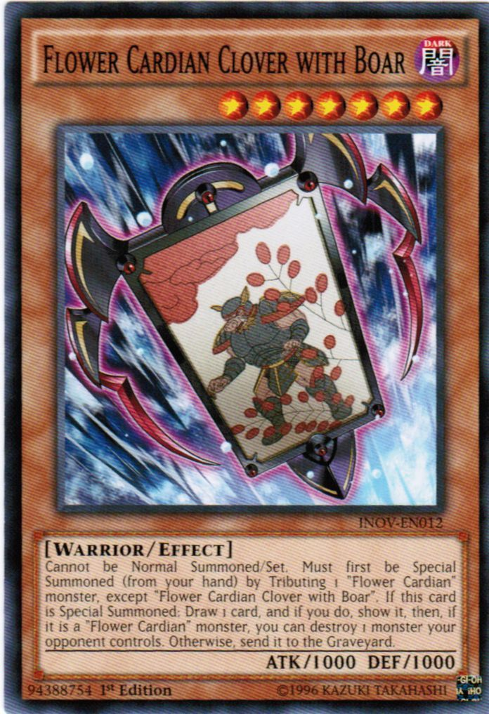 Cannot be Normal Summoned/Set. Must first be Special Summoned (from your hand) by Tributing 1 "Flower Cardian" monster, except "Flower Cardian Clover with Boar". If this card is Special Summoned: Draw 1 card, and if you do, show it, then, if it is a "Flower Cardian" monster, you can destroy 1 monster your opponent controls. Otherwise, send it to the Graveyard.