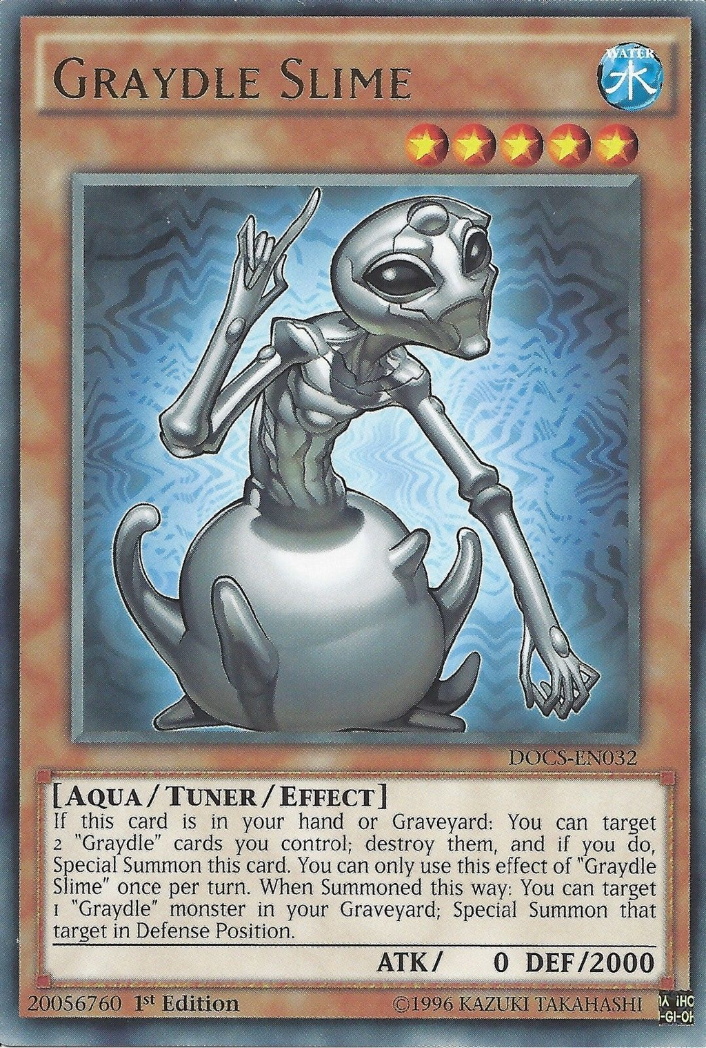 If this card is in your hand or Graveyard: You can target 2 "Graydle" cards you control; destroy them, and if you do, Special Summon this card. You can only use this effect of "Graydle Slime" once per turn. When Summoned this way: You can target 1 "Graydle" monster in your Graveyard; Special Summon that target in Defense Position.