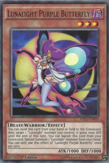 You can send this card from your hand or field to the Graveyard, then target 1 "Lunalight" monster you control; it gains 1000 ATK until the end of this turn. You can banish this card from your Graveyard; Special Summon 1 "Lunalight" monster from your hand. You can only use this effect of "Lunalight Purple Butterfly" once per turn.
