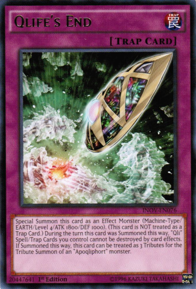Special Summon this card as an Effect Monster (Machine-Type/EARTH/Level 4/ATK 1800/DEF 1000). (This card is NOT treated as a Trap Card.) During the turn this card was Summoned this way, "Qli" Spell/Trap Cards you control cannot be destroyed by card effects. If Summoned this way, this card can be treated as 3 Tributes for the Tribute Summon of an "Apoqliphort" monster.