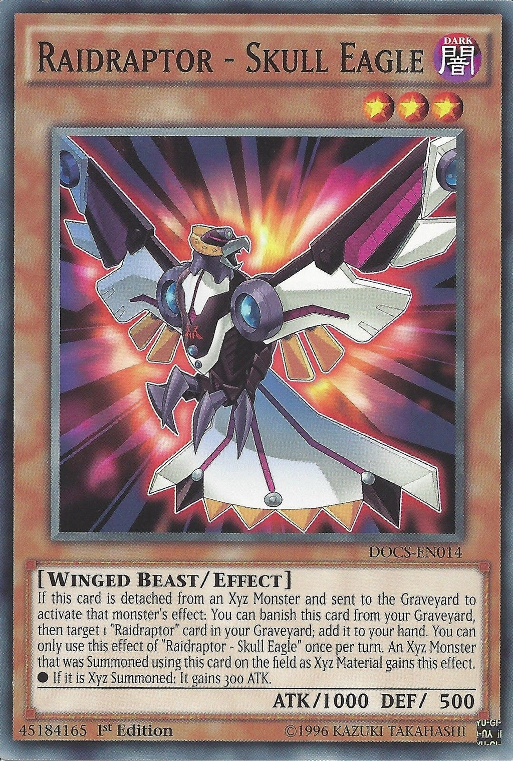 If this card is detached from an Xyz Monster and sent to the Graveyard to activate that monster's effect: You can banish this card from your Graveyard, then target 1 Raidraptor" card in your Graveyard; add it to your hand. You can only use this effect of "Raidraptor - Skull Eagle" once per turn. An Xyz Monster that was Summoned using this card on the field as Xyz Material gains this effect.