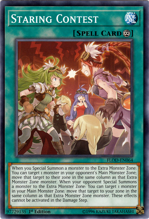 When you Special Summon a monster to the Extra Monster Zone: You can target 1 monster in your opponent's Main Monster Zone; move that target to their zone in the same column as that Extra Monster Zone monster. When your opponent Special Summons a monster to the Extra Monster Zone: You can target 1 monster in your Main Monster Zone; move that target to your zone in the same column as that Extra Monster Zone monster. These effects cannot be activated in the Damage Step.