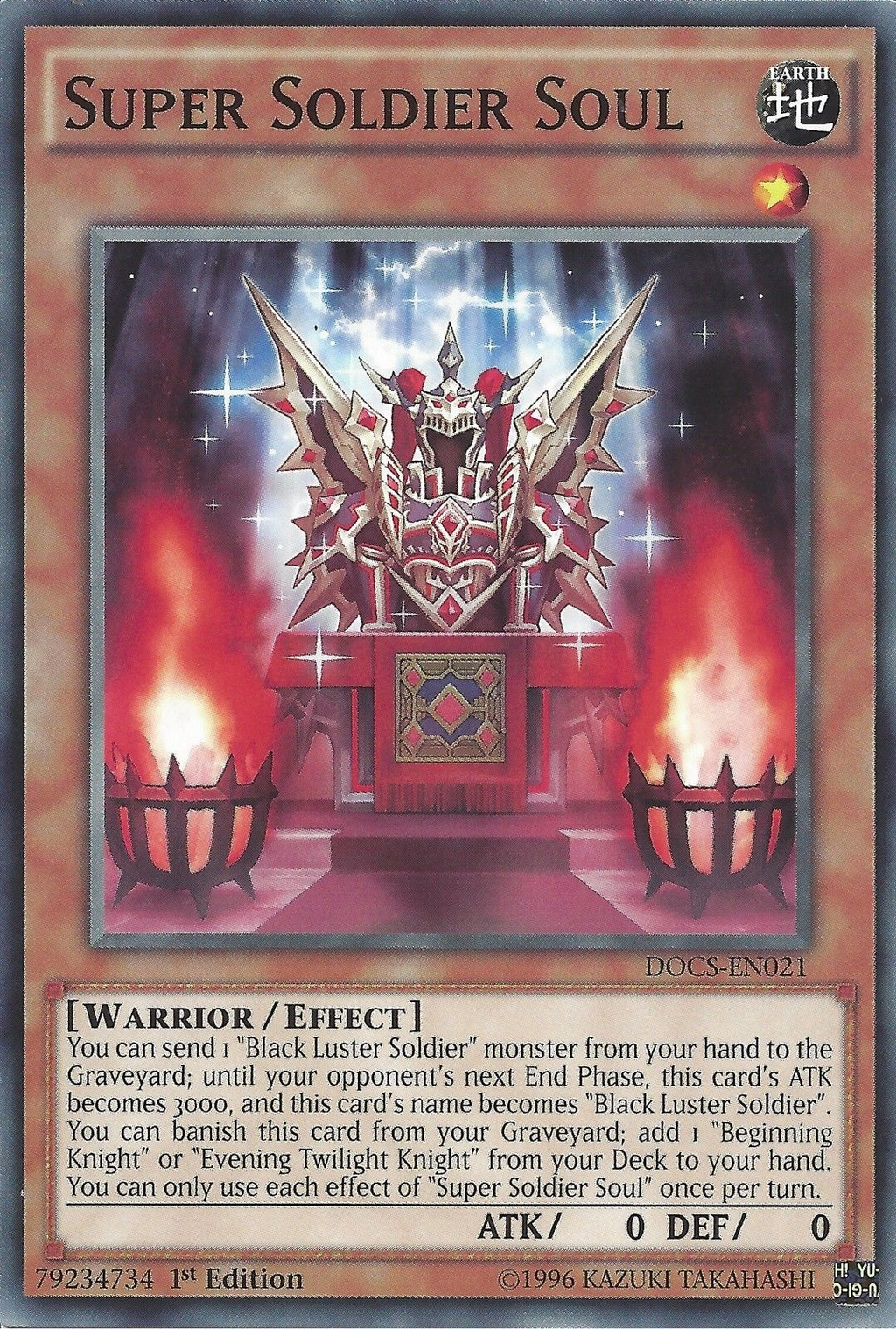 You can send 1 "Black Luster Soldier" monster from your hand to the Graveyard; until your opponent's next End Phase, this card's ATK becomes 3000, also its name becomes "Black Luster Soldier". You can banish this card from your Graveyard; add 1 "Beginning Knight" or "Evening Twilight Knight" from your Deck to your hand. You can only use each effect of "Super Soldier Soul" once per turn.
