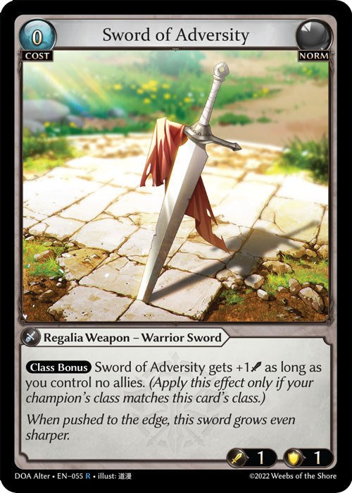[Class Bonus] Sword of Adversity gets +1 power as long as you control no allies. (Apply this effect only if your champion's class matches this card's class.)