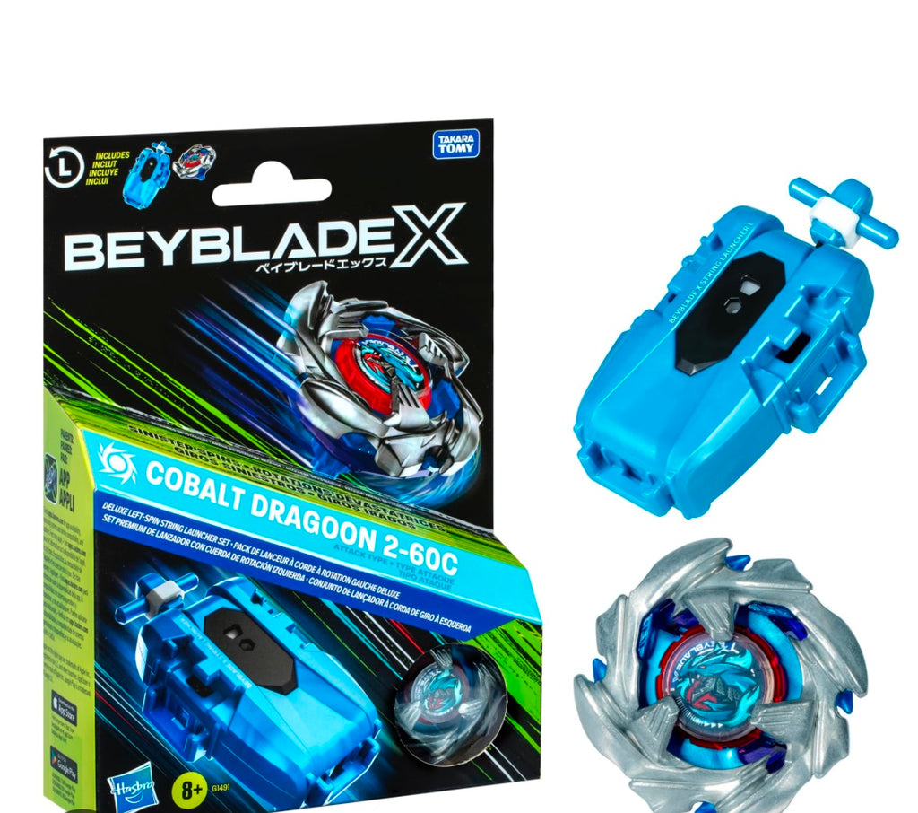 SWEEP INTO SINISTER SPINS: The Cobalt Dragoon String Launcher design allows for quick launches with no need to insert a ripcord for each battle and double the pull! This Set include 1 Beyblade X left-spin string launcher and 1 Beyblade X left-spinning top