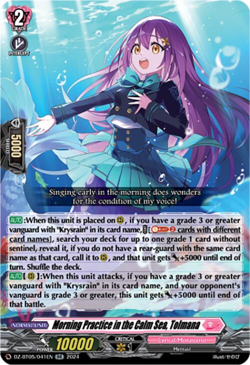 [AUTO](RC):When this unit attacks, if you have a grade 3 or greater vanguard with "Krysrain" in its card name, and your opponent's vanguard is grade 3 or greater, this unit gets [Power] +5000 until end of that battle.