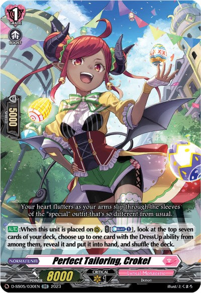 [AUTO]:When this unit is placed on (RC), [COST][Counter-Blast 1], look at the top seven cards of your deck, choose up to one card with the DressUp ability from among them, reveal it and put it into hand, and shuffle the deck.