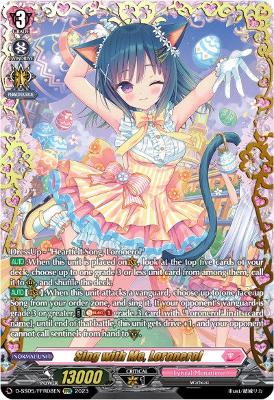 [AUTO](VC):When this unit attacks a vanguard, choose up to one face up Song from your order zone, and sing it. If your opponent's vanguard is grade 3 or greater, [COST][Soul-Blast 1] grade 3 card with "Loronerol" in its card name], until end of that battle, this unit gets drive +1, and your opponent cannot call sentinels from hand to (GC).