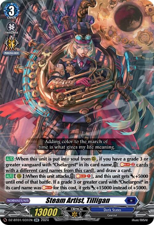 [AUTO](RC):When this unit attacks, [COST][Soul-Blast 1], and this unit gets [Power] +5000 until end of that battle. If a grade 3 or greater card with "Oselargest" in its card name was [Soul-Blast] for this cost, it gets [Power] +15000 instead of +5000.
