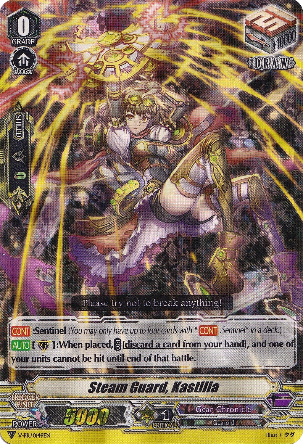 [AUTO](GC):When placed, [COST][discard a card from your hand], and one of your units cannot be hit until end of that battle."