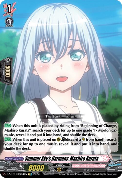 [AUTO]:When this unit is placed by riding from "Beginning of Change, Mashiro Kurata", search your deck for up to one grade 1 music, reveal it and put it into hand, and shuffle the deck.