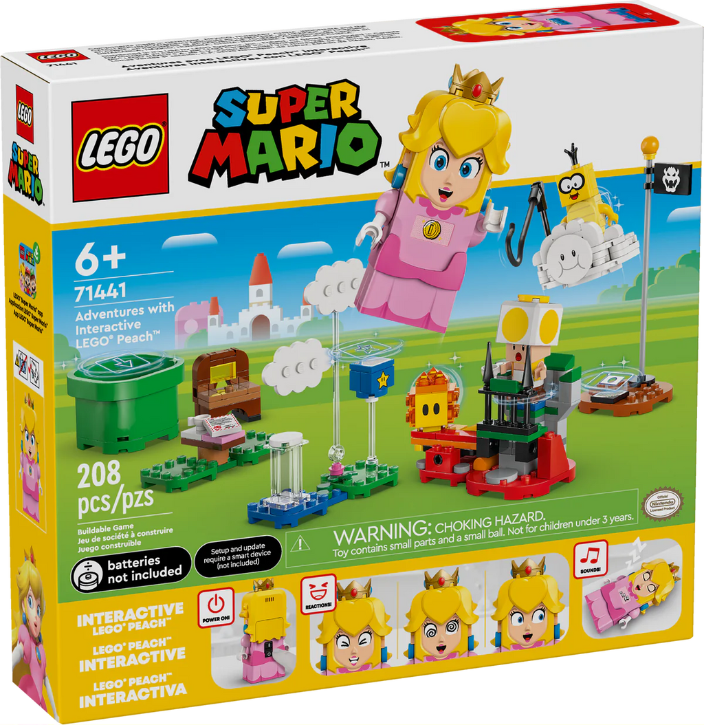 Join an iconic Super Mario™ character for a picnic and fly on a cloud to rescue the Yellow Toad with the Adventures with Interactive LEGO® Peach™ princess toy playset for kids (71441). A top Nintendo® gift for girls, boys and gamers aged 6 and up, the set features an interactive LEGO Peach figure, plus Lakitu, a Yellow Toad and a Lava Bubble. Travel from the Start Pipe to the Goal Pole triggering digital reactions from LEGO Peach and collecting coins along the way. Have a picnic, read a letter saying that the Yellow Toad has been captured, topple Lakitu from the cloud, and fly, flip and loop the loop on the cloud on the way to rescue the Yellow Toad. The buildable cloud toy also has a fishing pole for Lakitu to lift the Yellow Toad’s picnic seat. Find building instructions in the box or on the LEGO® Super Mario™ app. For extra adventures, combine the builds and characters in this playset with those in other sets in the extensive LEGO Super Mario assortment.
