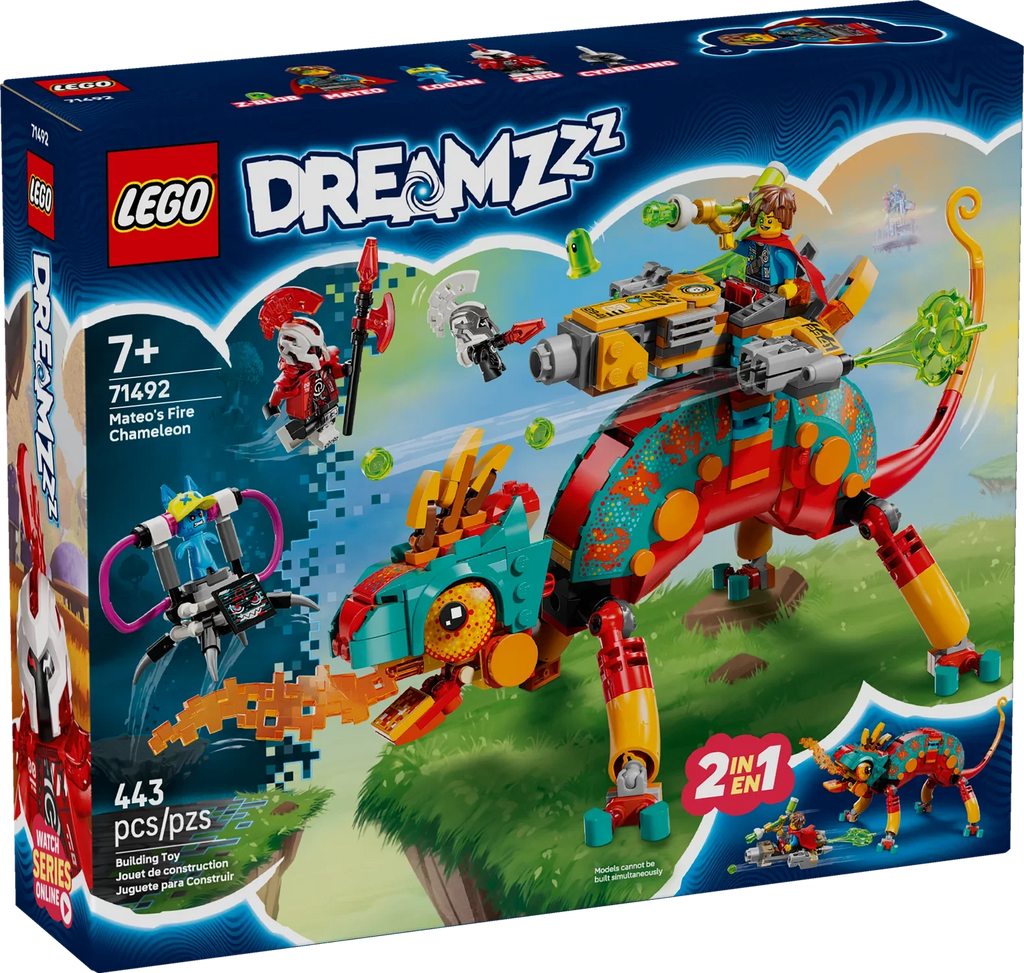 Kindle creativity with the LEGO® DREAMZzz™ Mateo’s Fire Chameleon (71492) building set for kids aged 7 plus, which lets boys and girls team up with hero Mateo to rescue Logan from the villainous Zero. Young dreamers will have fun building a chameleon figure before discovering 2 ways to transform it – they can build it as a fire chameleon guardian with a mounted blaster turret and 4 stud shooters or turn it into a speedy jet and mini mech figure.
