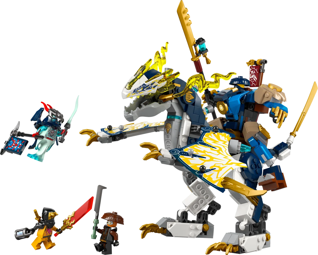 Rogue’s Mech Dragon Rider (71843) combo ninja toy lets boys and girls aged 8 plus enact tales from season 3 of the NINJAGO® Dragons Rising TV show. Kids can separately play with a mech toy and the first-ever NINJAGO robot dragon toy before combining them into the awesome Rogue’s Mech Dragon Rider. The mech toy has movable arms and legs, a chest that opens to place a minifigure inside and a sword, while the dragon figure has movable wings, head, jaw, legs and tail and a sword. There are 4 minifigures: ninja warriors Rogue and Arin, and the villainous duo of Rox and a Spectral Dragonian Warrior who have a banner with a secret message that can only be read using Arin’s reveal blade accessory.