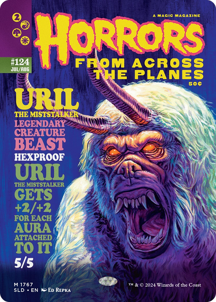 Hexproof (This creature can't be the target of spells or abilities your opponents control.) Uril, the Miststalker gets +2/+2 for each Aura attached to it.