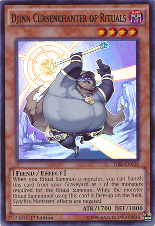 When you Ritual Summon a monster, you can banish this card from your Graveyard as 1 of the monsters required for the Ritual Summon. While the monster Ritual Summoned using this card is face-up on the field, Synchro Monsters' effects are negated.